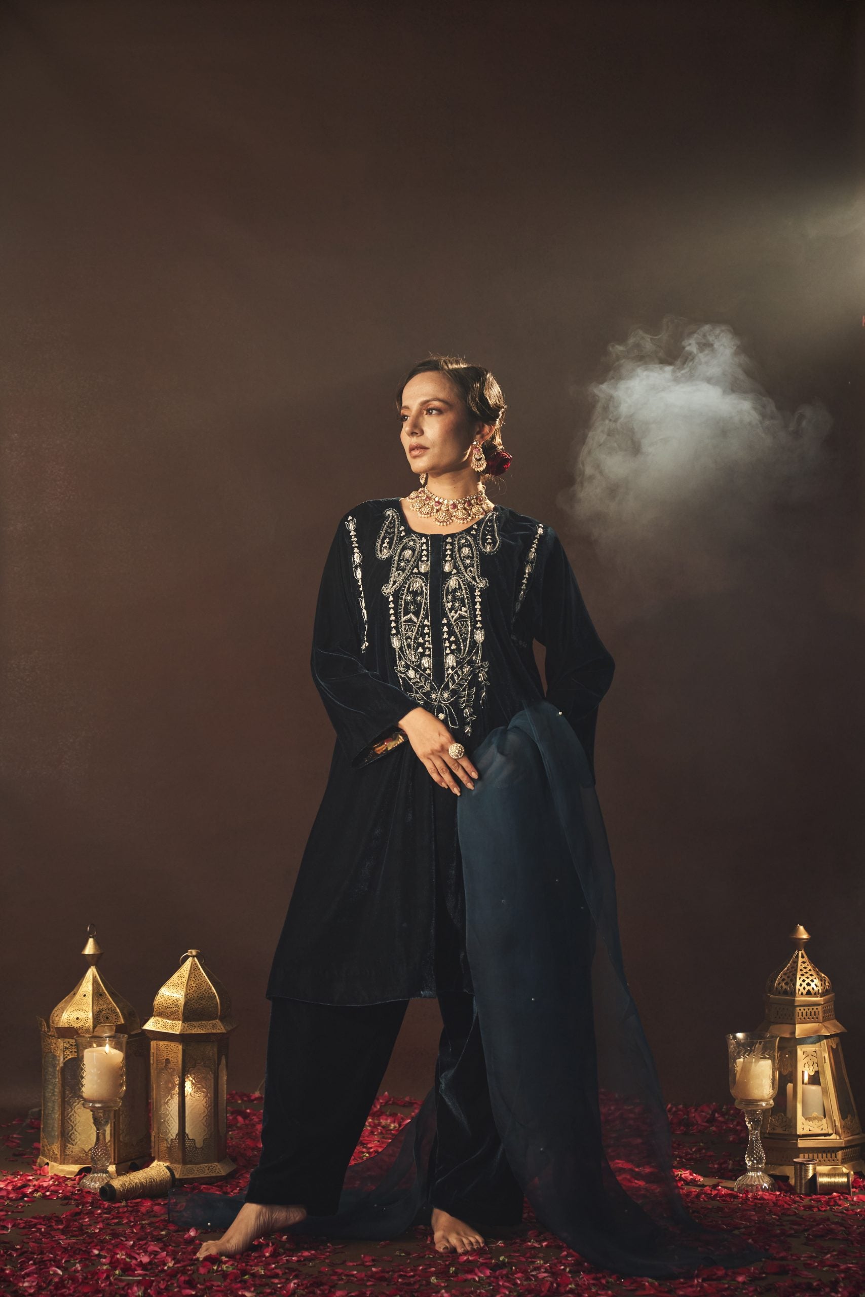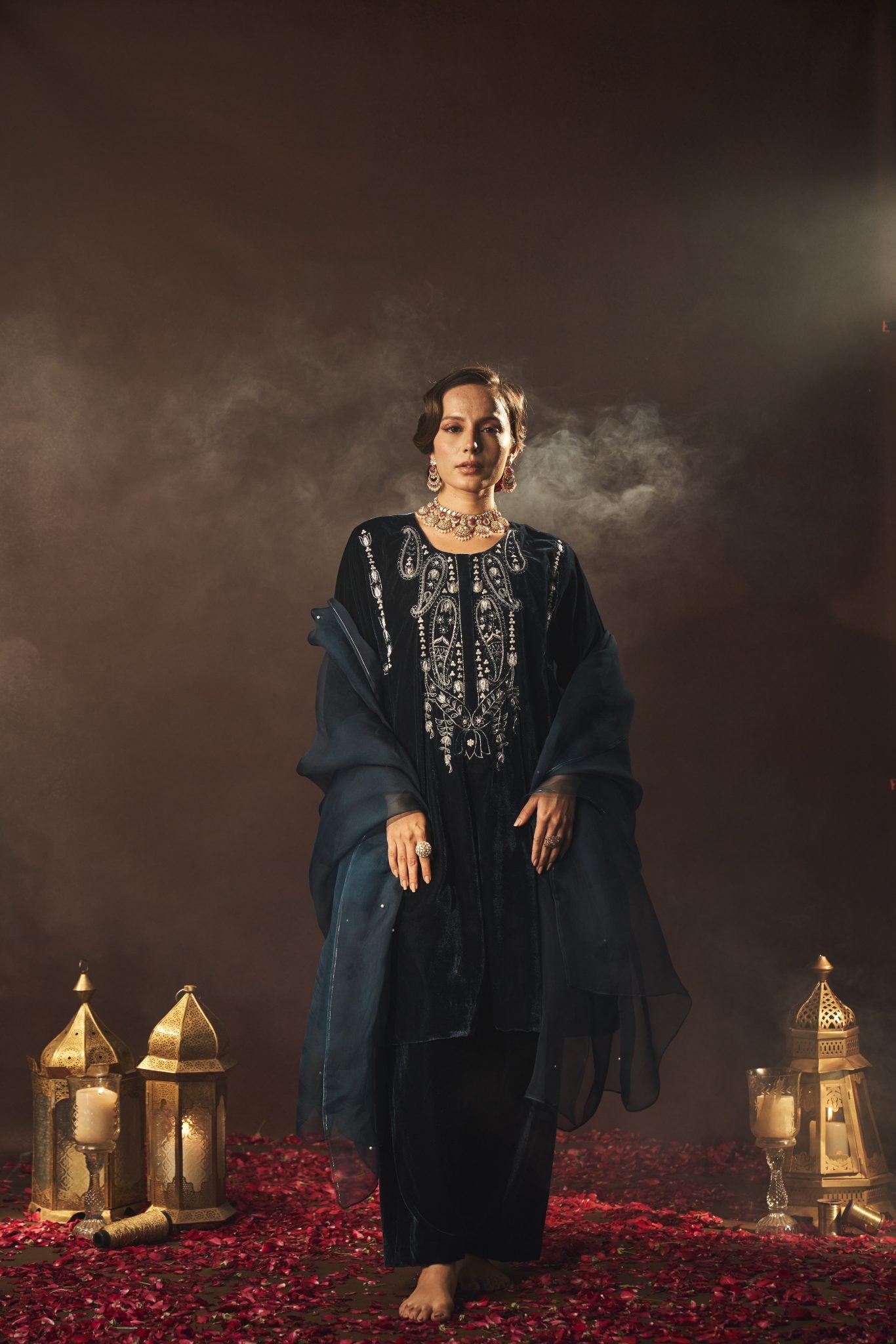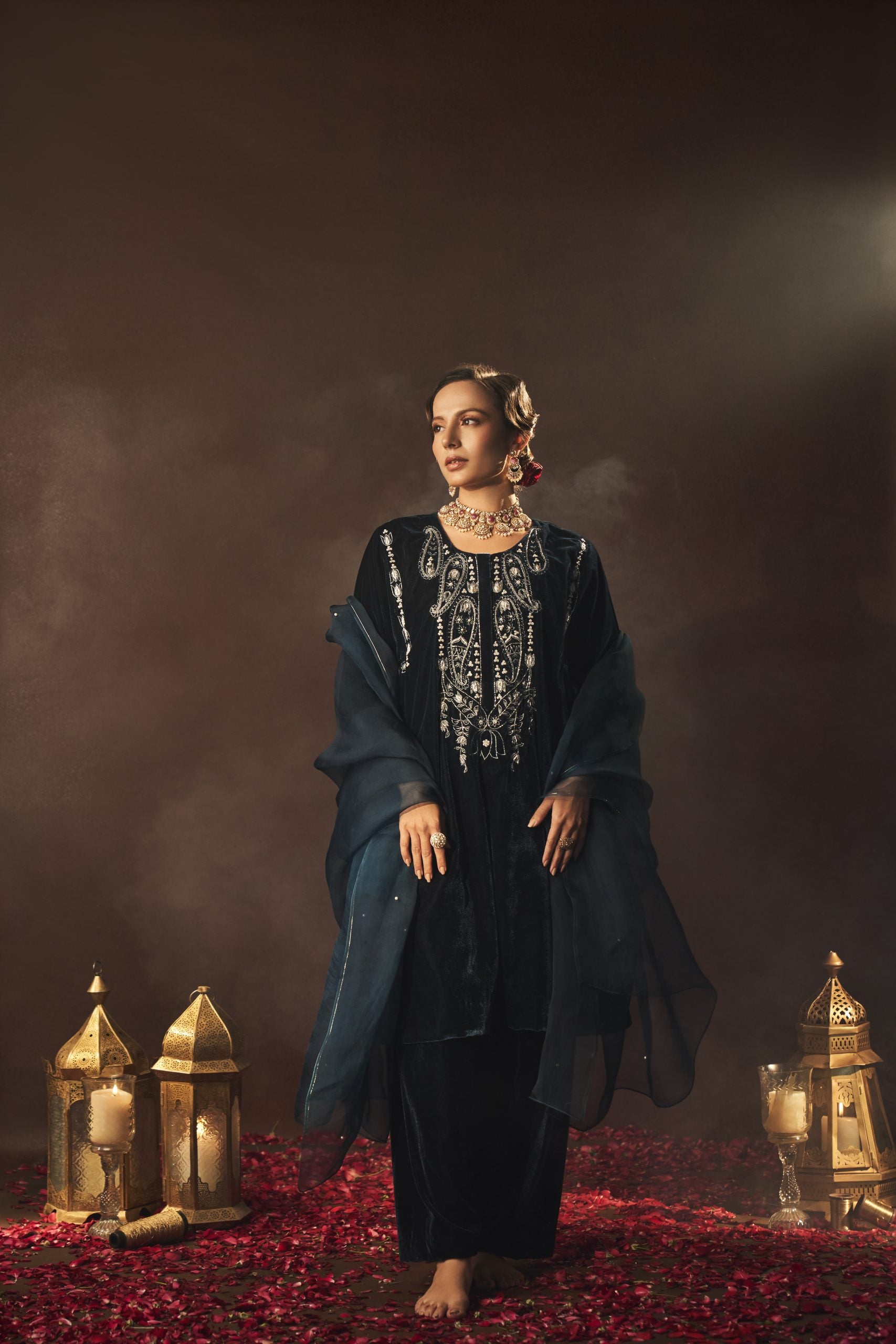 Mansi Gajjar features a mesmerizing Turquoise Kurta Set that captivates with its elegance. The eye-catching kurta is crafted in silk velvet with aari and zardosi embroidery. It is paired with salwar pants and a dupatta. Accessorize the designer kurta set with statement earrings and heels for sangeet or engagement ceremonies.