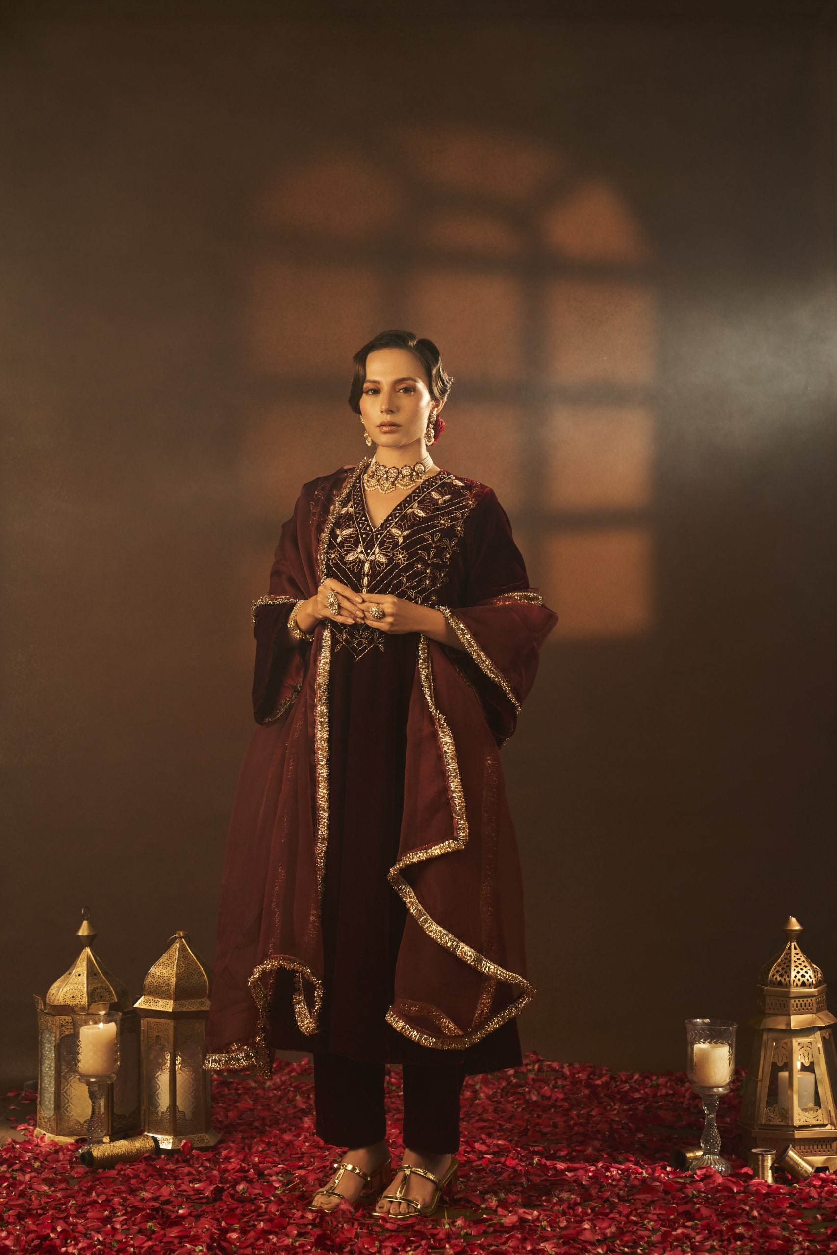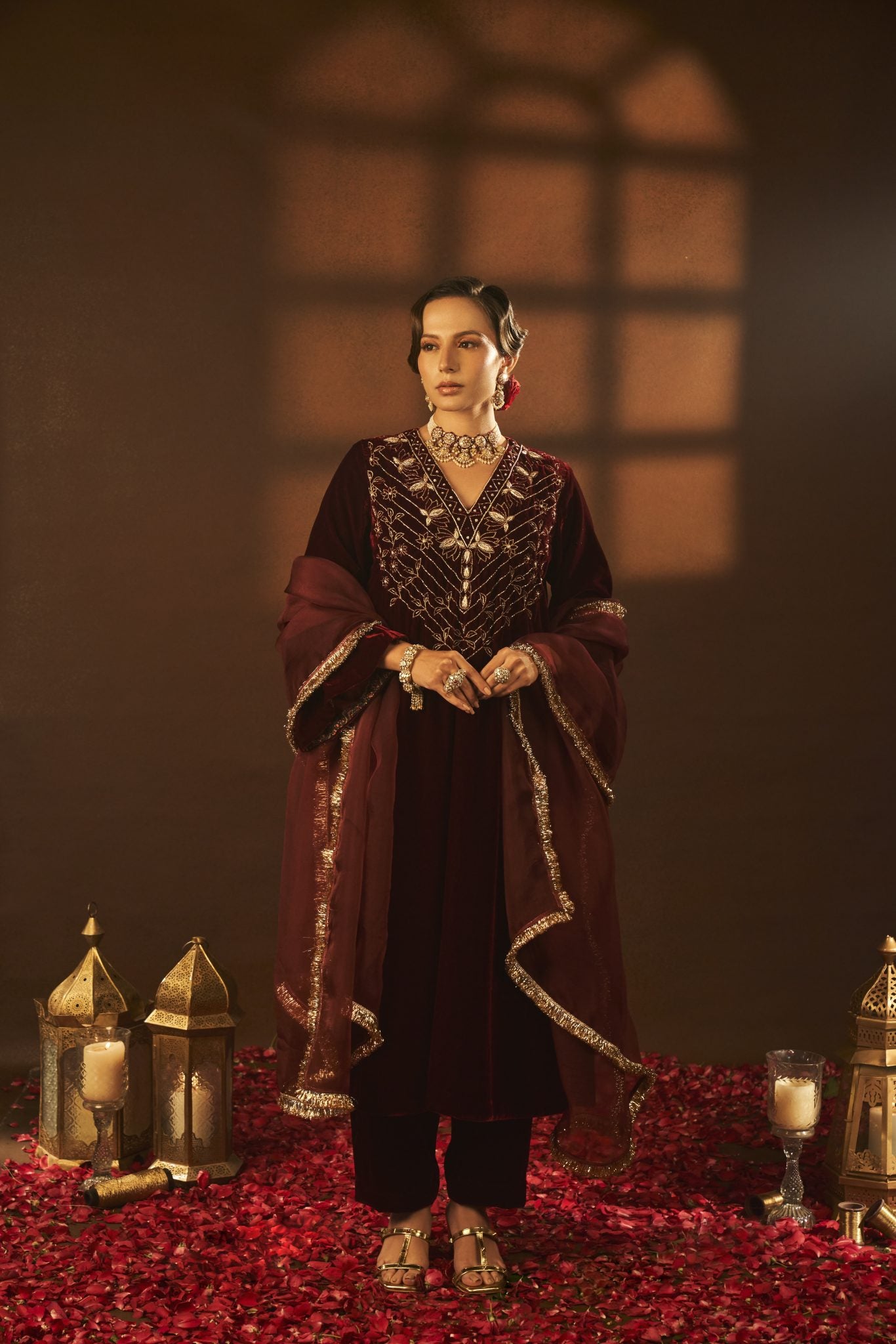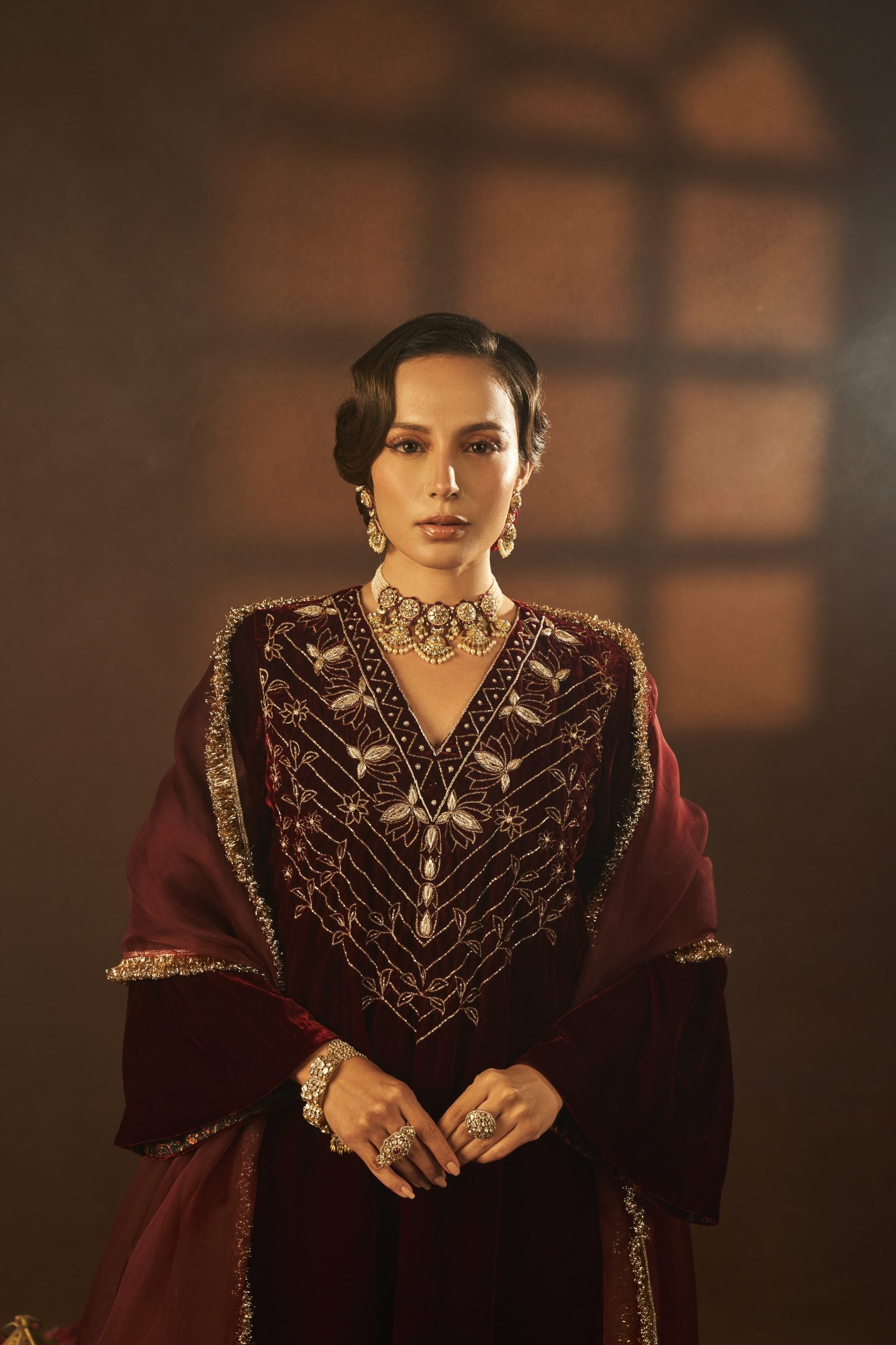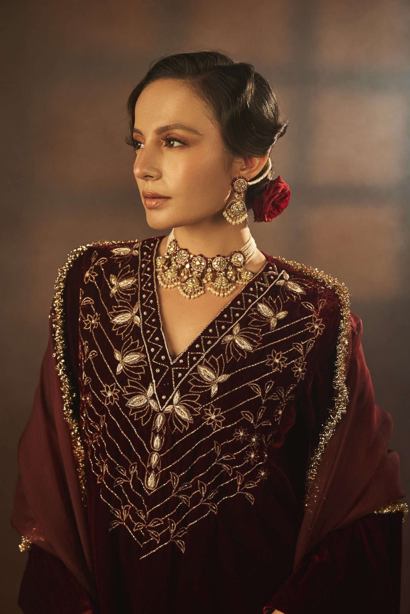 Mansi Gajjar features a mesmerizing Maroon A-Line Kurta Set that captivates with its elegance. The eye-catching kurta is crafted in silk velvet with aari and zardosi embroidery. It is paired with pants and a dupatta. Accessorize the designer kurta set with statement earrings and heels for sangeet or wedding ceremonies.