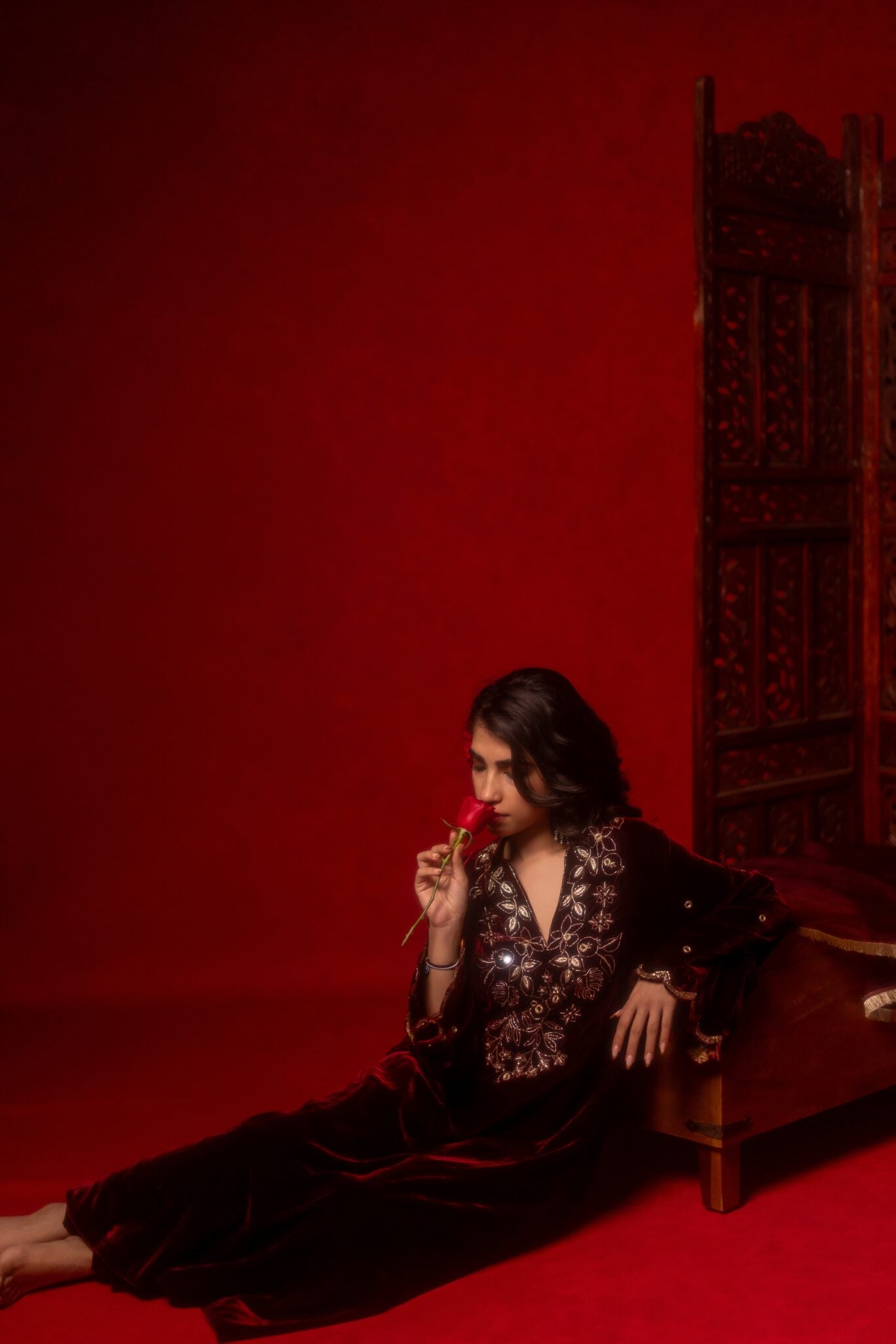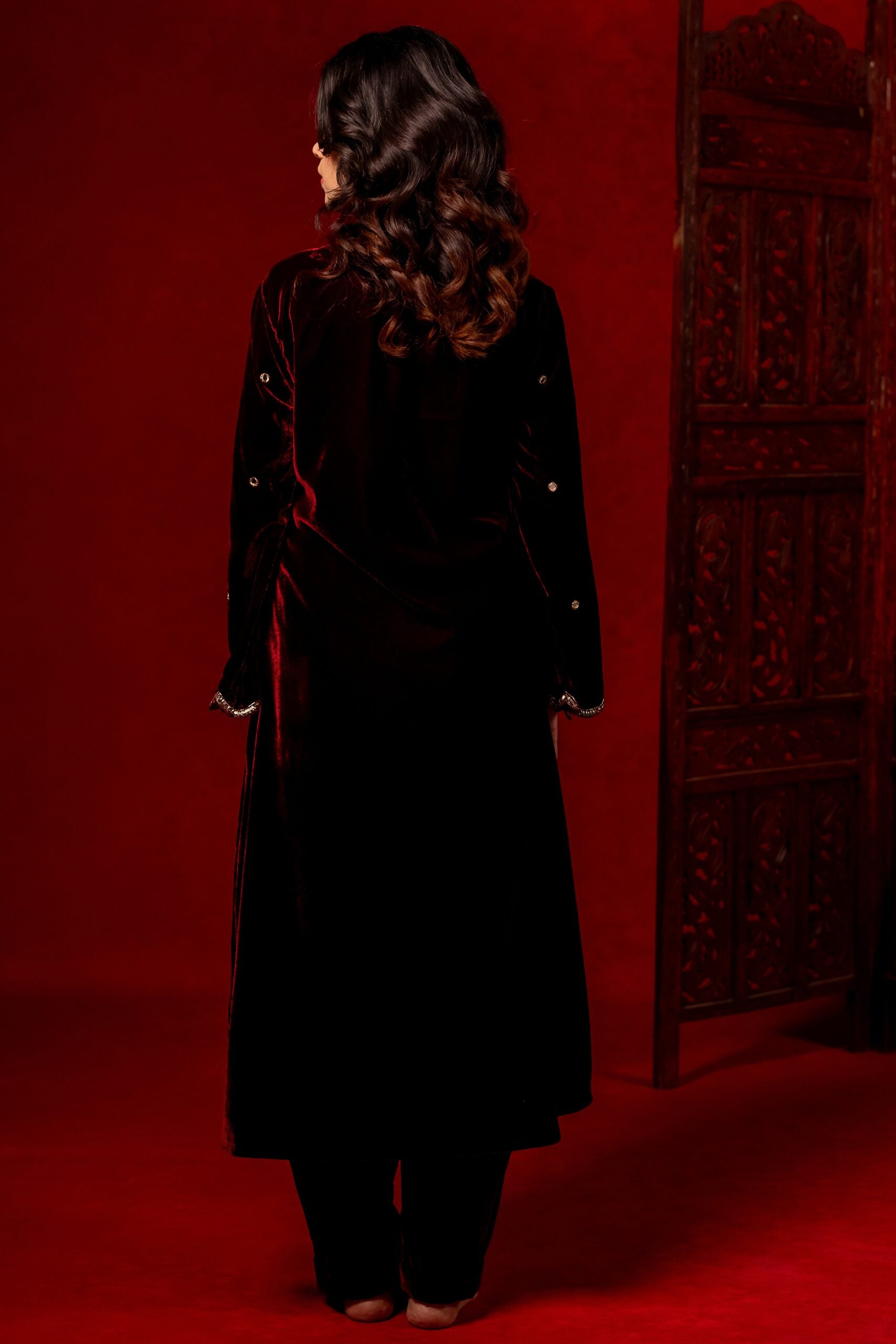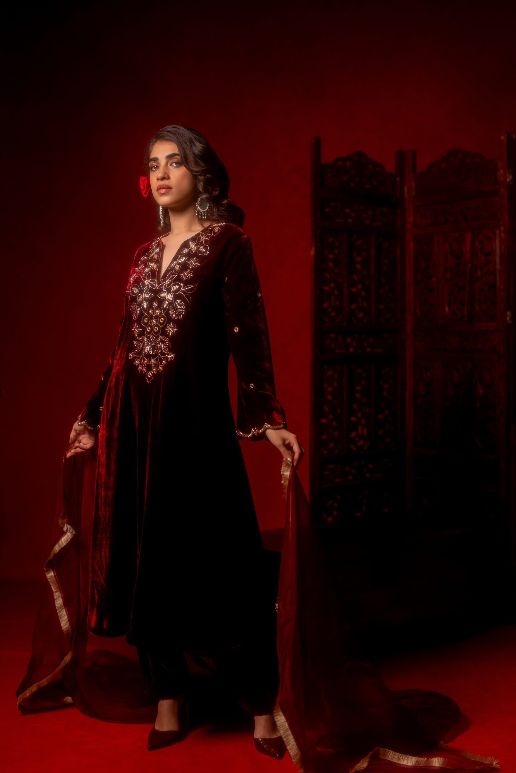 Meharoon velvet hand embroidered Kurta set paired with a matching salwar and silk organza duppatta.