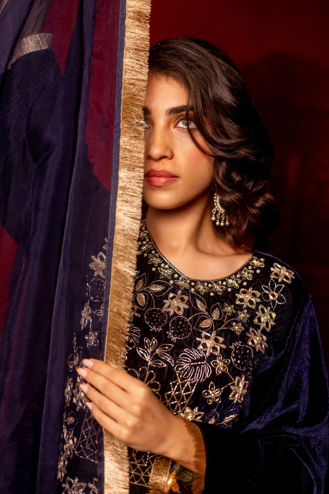 Navy Blue Silk Velvet Hand Embroidered Kurta Set. It is paired with a with a matching salwar and silk organza duppatta.