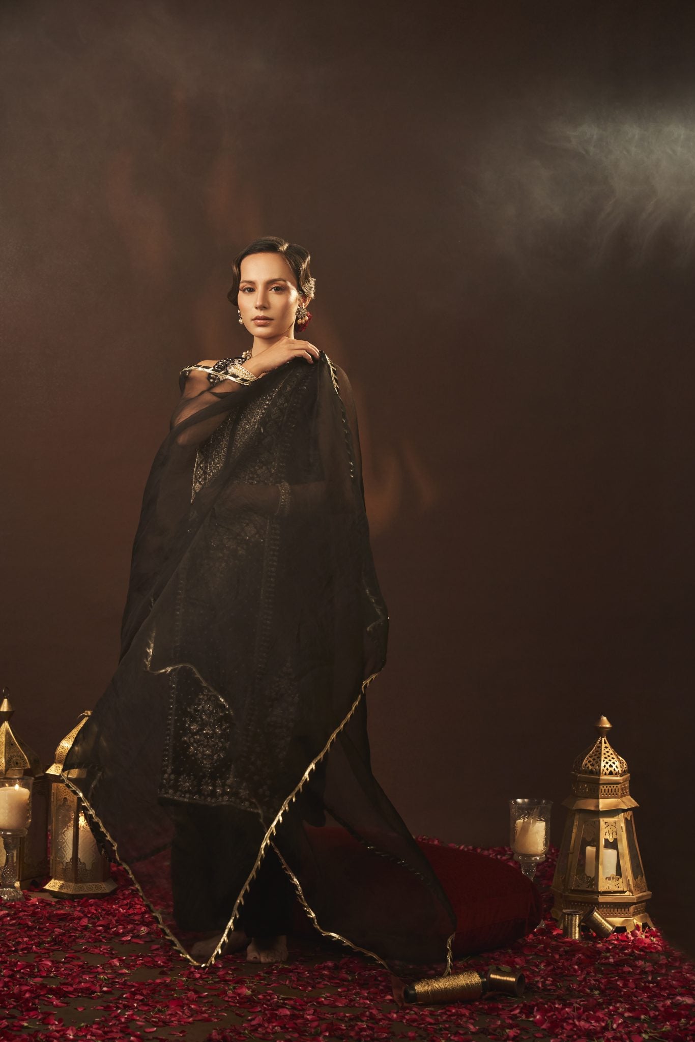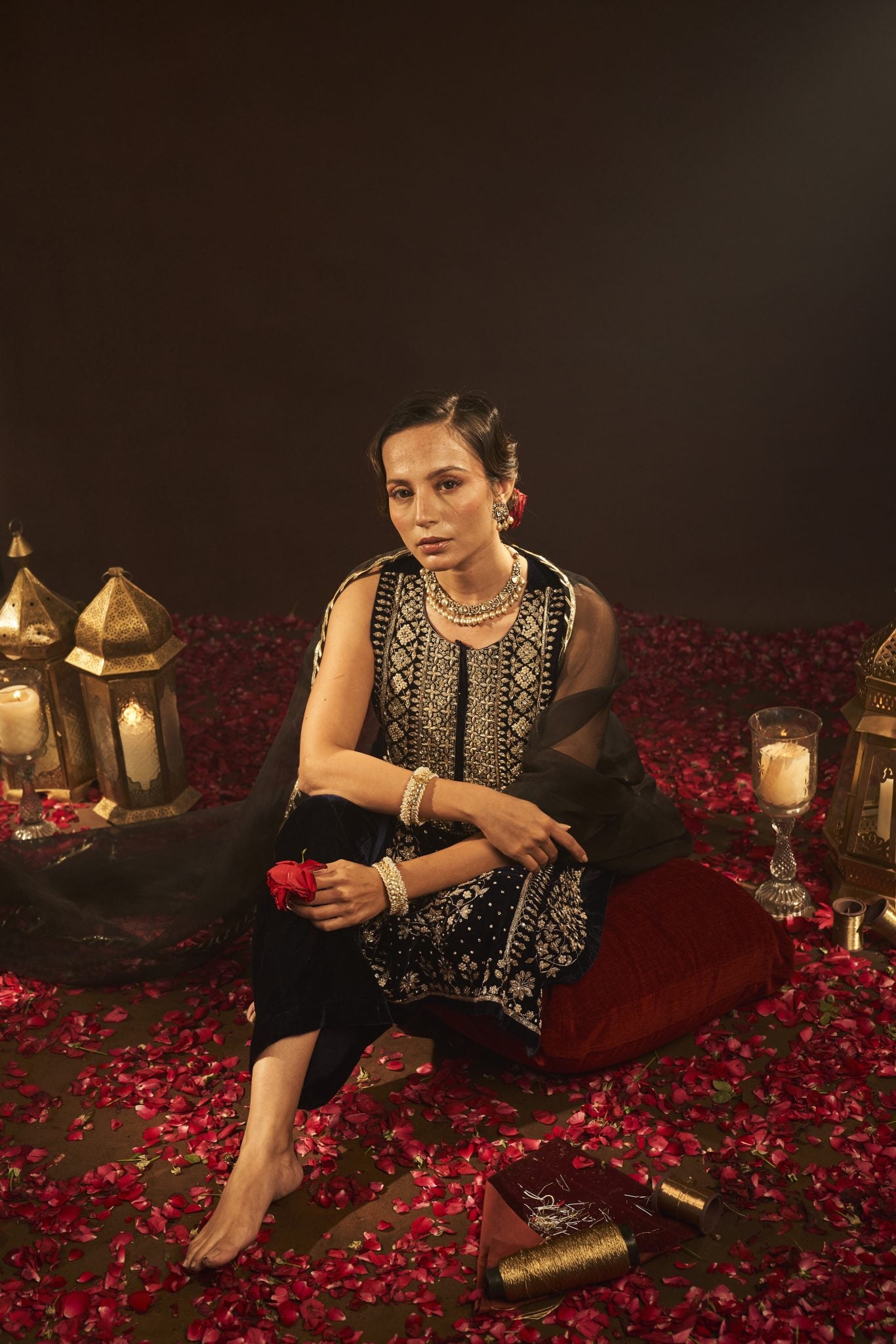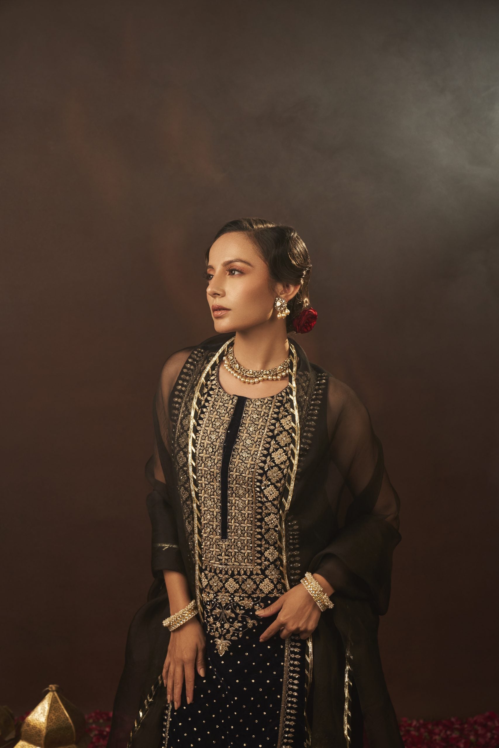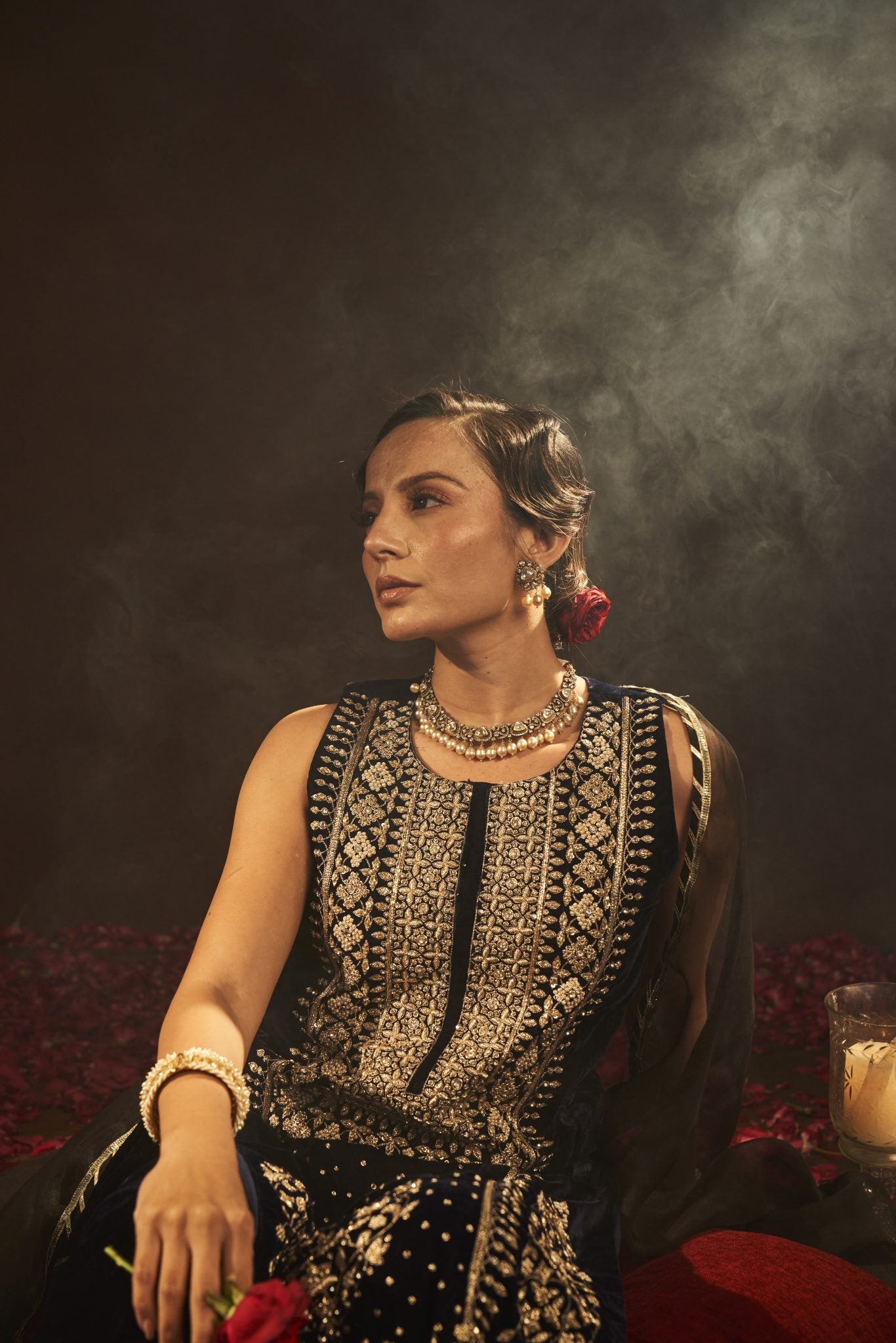 Mansi Gajjar features a mesmerizing Navy Blue Kurta Set that captivates with its elegance. The eye-catching kurta is crafted in silk velvet with hand embroidery. It is paired with ijaar pants and a black dupatta. Accessorize the designer kurta set with statement earrings and heels for sangeet ceremonies.