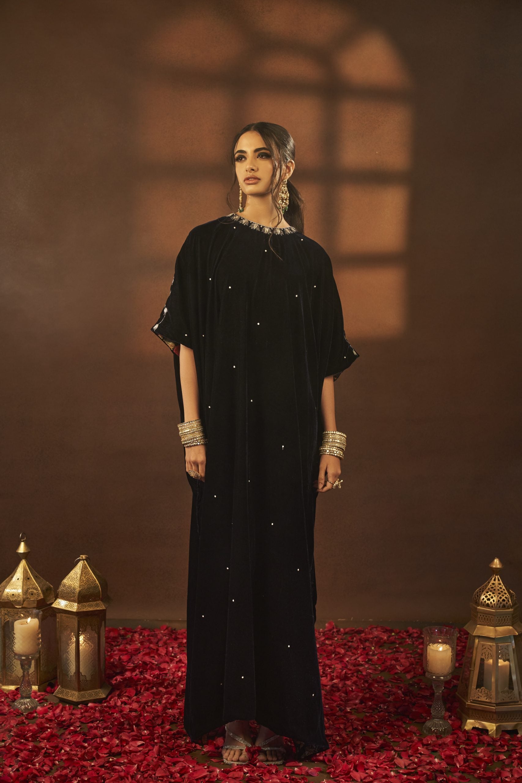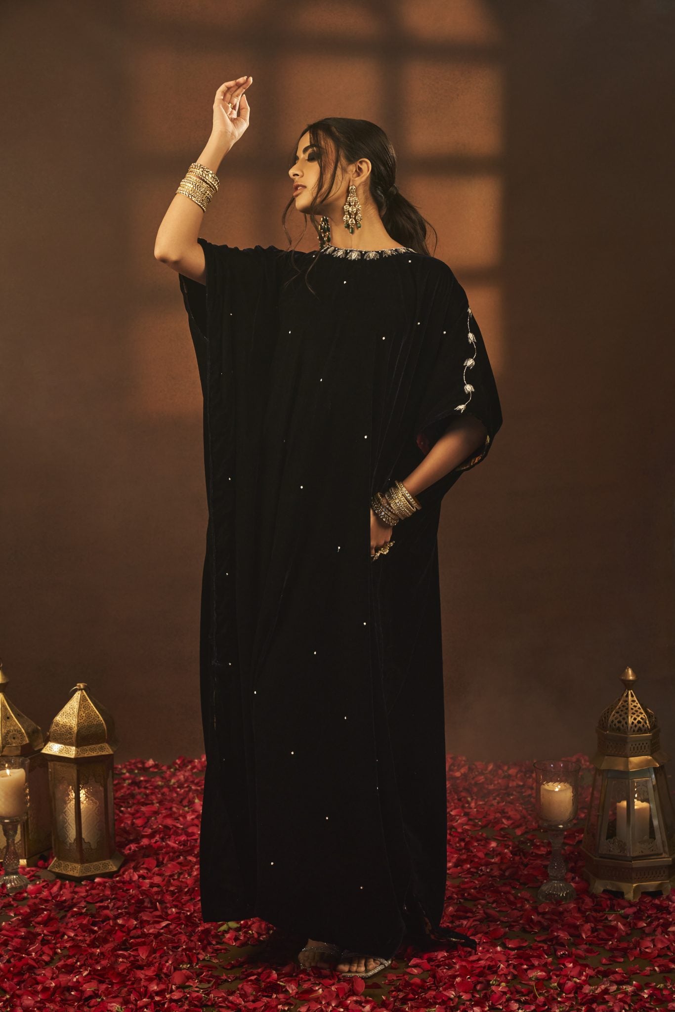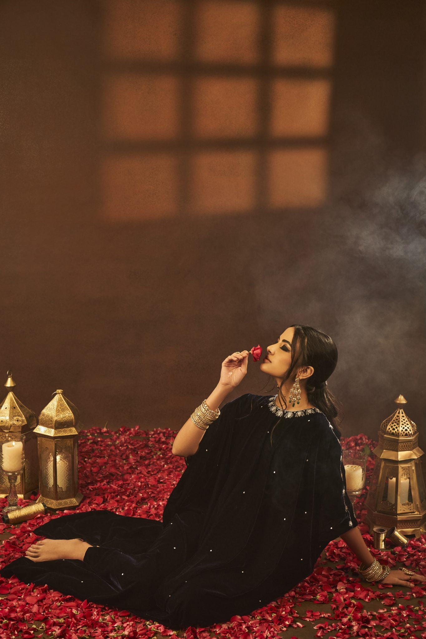 Mansi Gajjar features a mesmerizing Navy Blue Kaftan that captivates with its elegance. The eye-catching kaftan is crafted in silk velvet with slit detail, including aari and zardosi work. Accessorize the designer kaftan with statement earrings and heels for festive occasions.